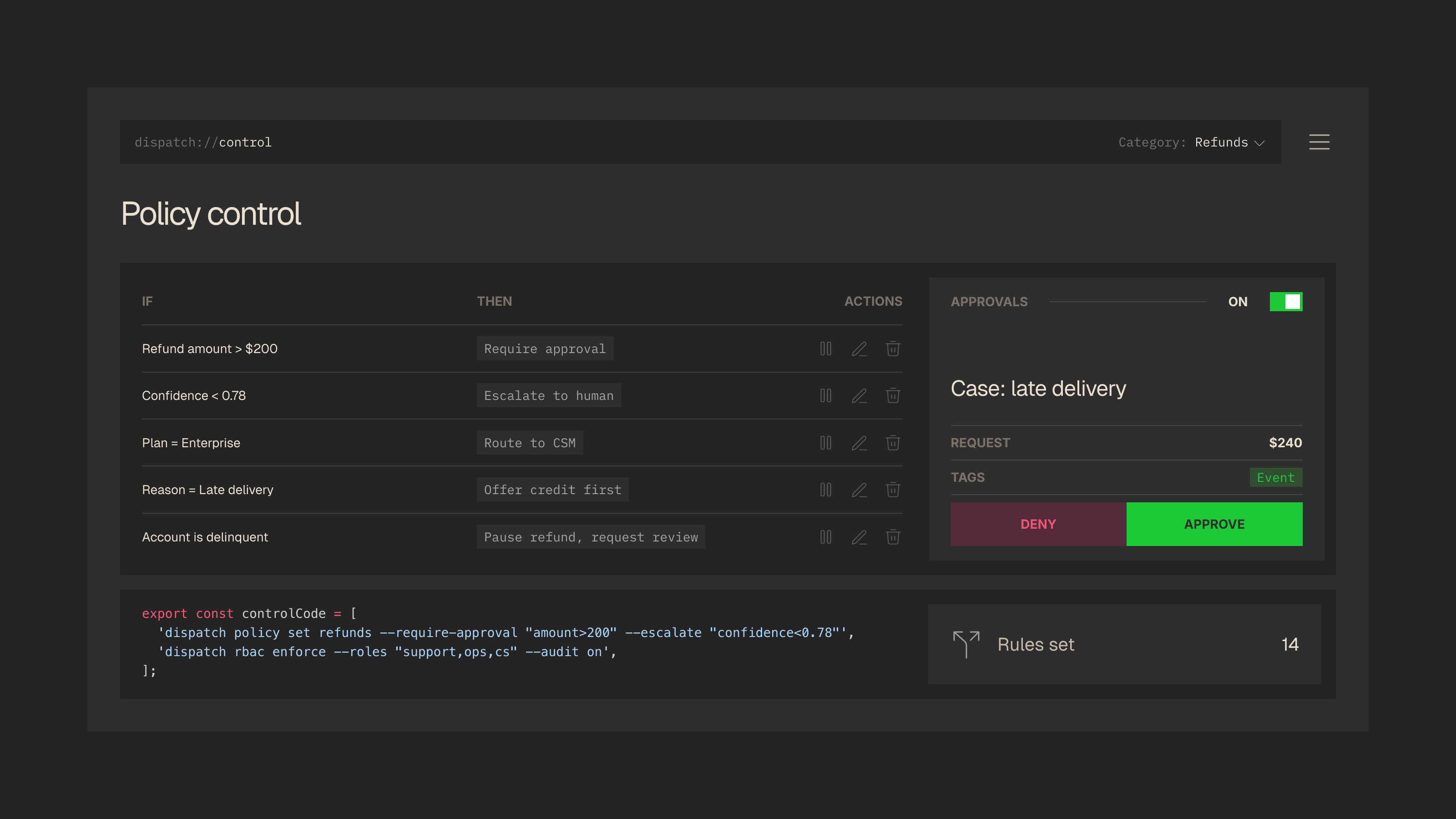 Apply configurable rules, review sensitive actions, and keep execution aligned with internal standards.