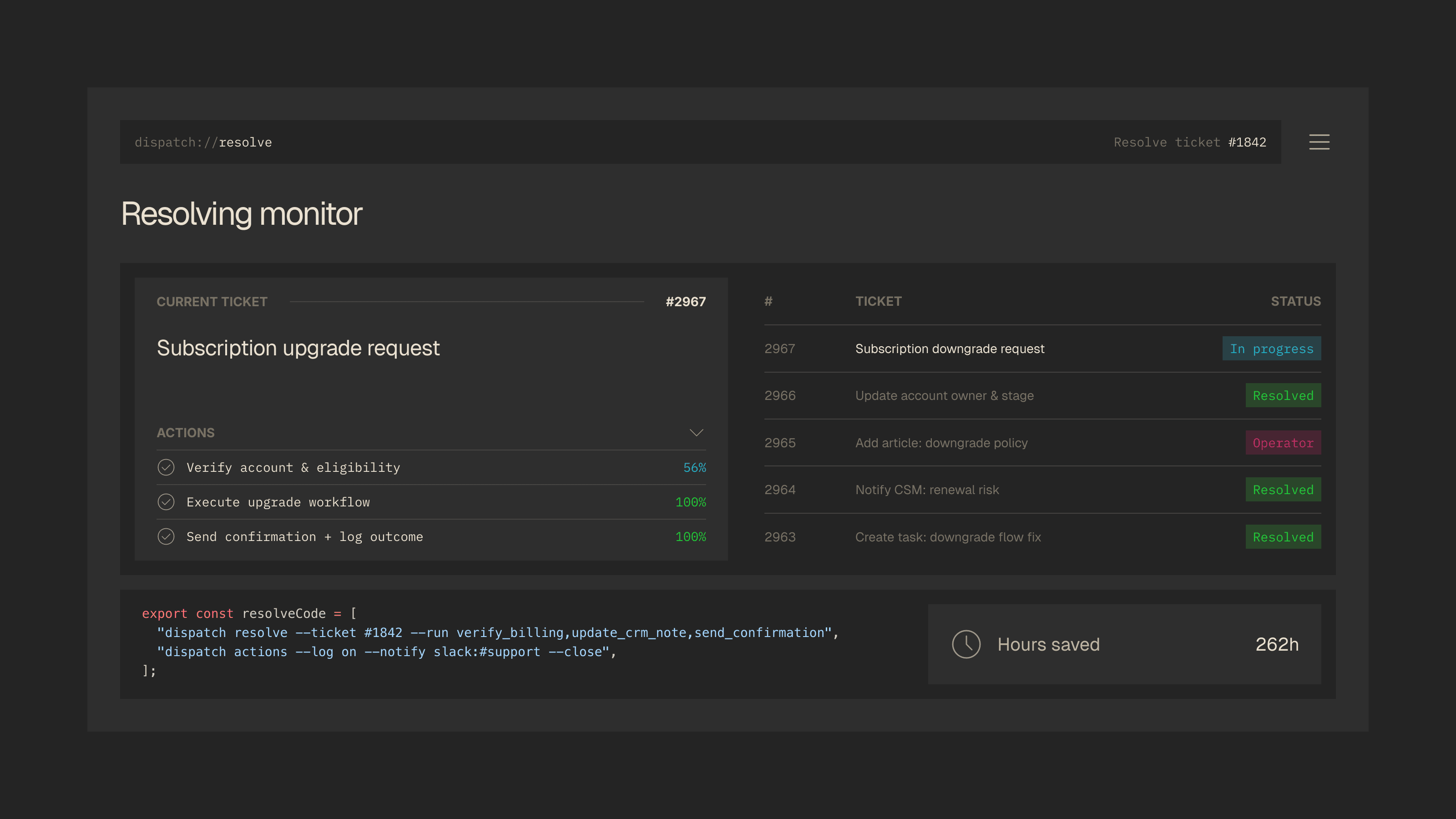 It connects your helpdesk, knowledge base, and CRM to resolve tickets, run approved workflows, and keep records accurate so your team ships faster outcomes with full visibility and control.